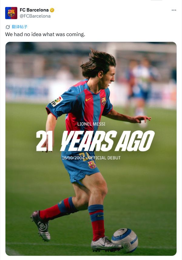 雷速体育10月16日讯 21年前的今天,梅西完成了个人在巴塞罗那的首秀。巴萨官方今天在社交媒体上晒图以纪念这个极具意义的日子。如今这位诺坎普国王离开巴萨已有4年,而巴萨在帖子中的配文“我们不知道接下来会发生什么”不禁让人对梅西未来是否会重返诺坎普浮想联翩。