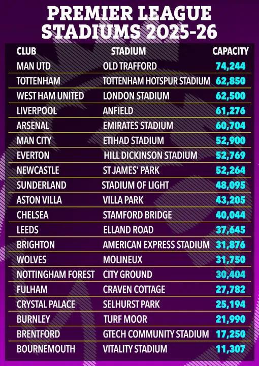 英超联赛2025-26赛季球场容量变化